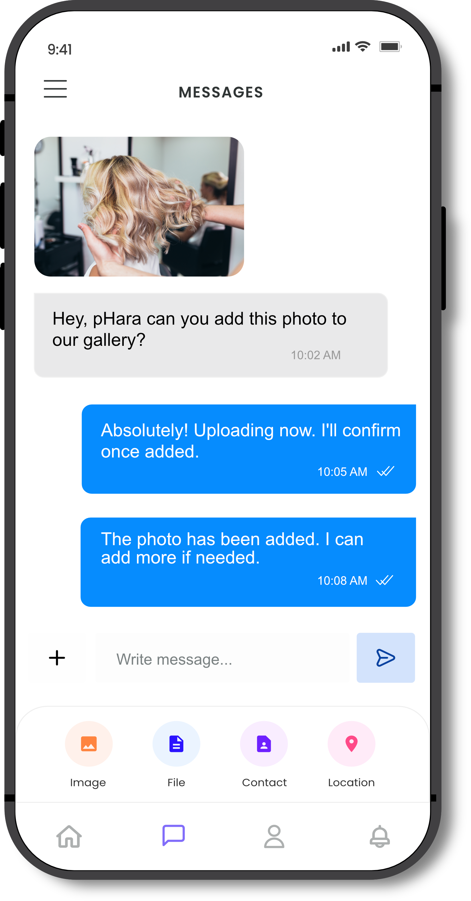 pHara AI revolutionizes salon website management. Simply text to update hours, staff bios, banners, or photos—no logins required.